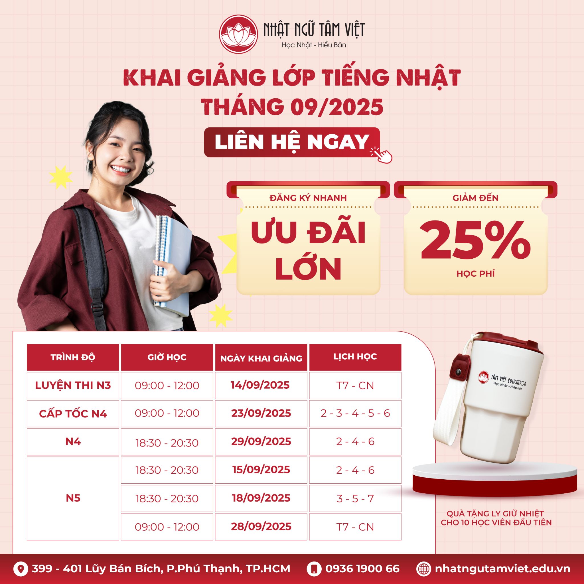 Với chương trình đào tạo chuẩn JLPT, ưu đãi hấp dẫn và lịch học đa dạng, Nhật ngữ Tâm Việt là địa chỉ lý tưởng để bạn bắt đầu hành trình chinh phục tiếng Nhật trong tháng 9/2025.