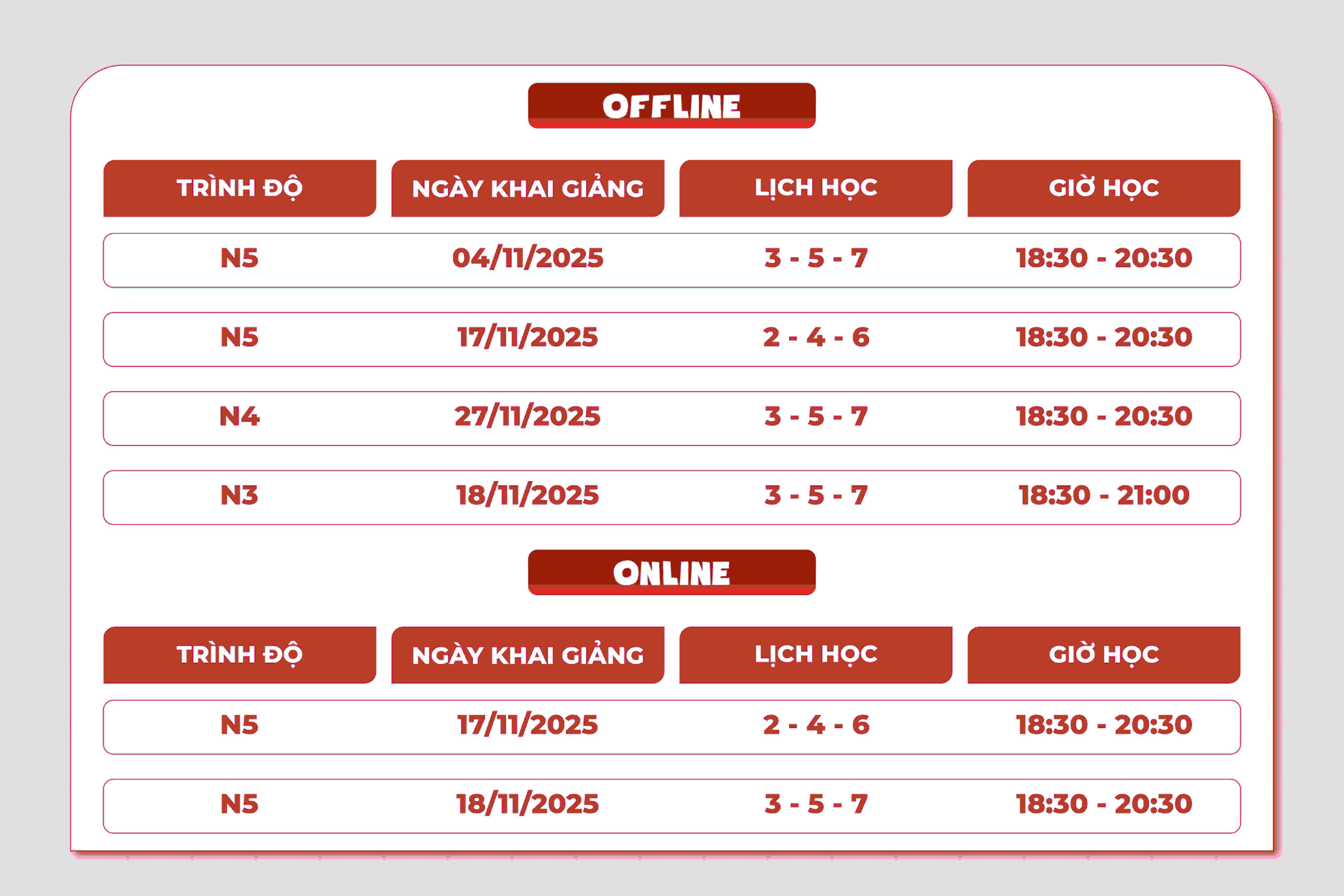 | Offline | 6 tháng – 72 buổi | 2-3 buổi/tuần | Bảng chữ cái, ~800 từ vựng, 120 mẫu ngữ pháp, 118 Kanji, giao tiếp cơ bản, luyện JLPT N5 |
